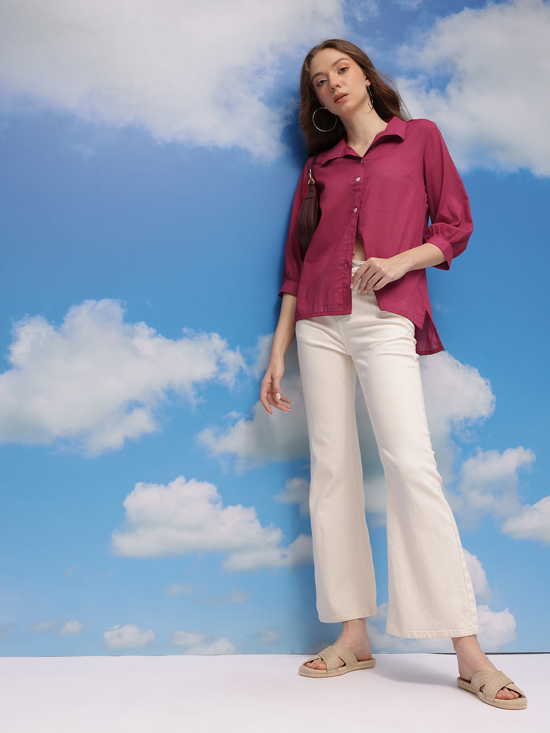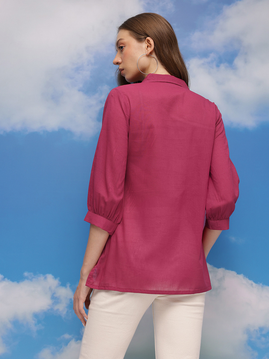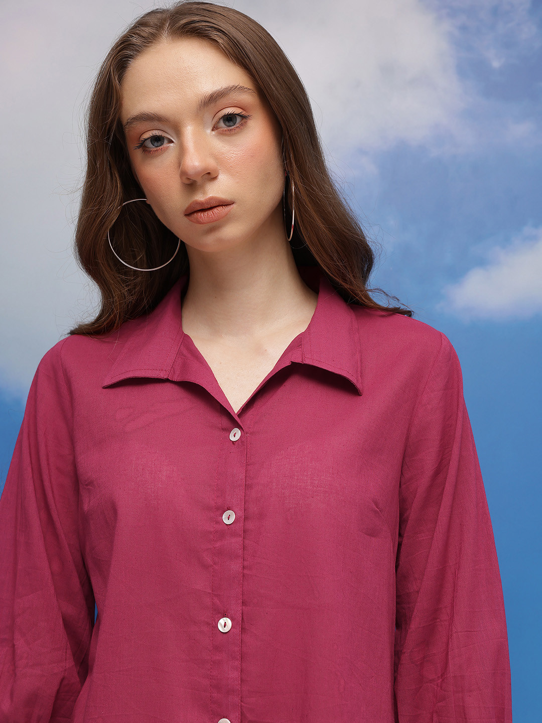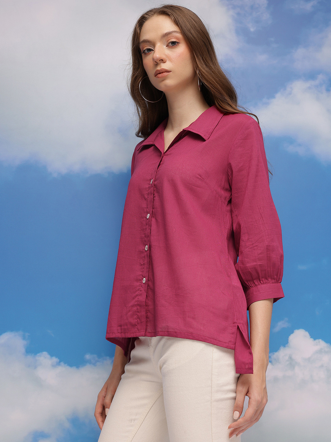 Magenta pink solid opaque casual shirt, has a spread collar, button placket, three-quarter regular sleeves, high-low hem